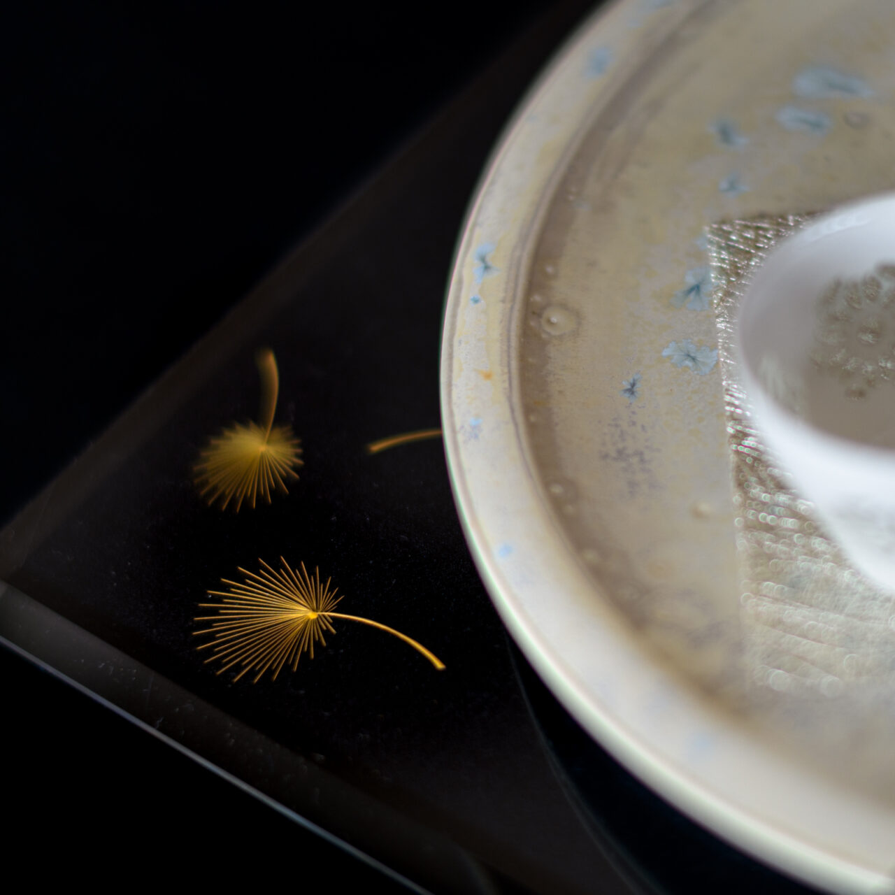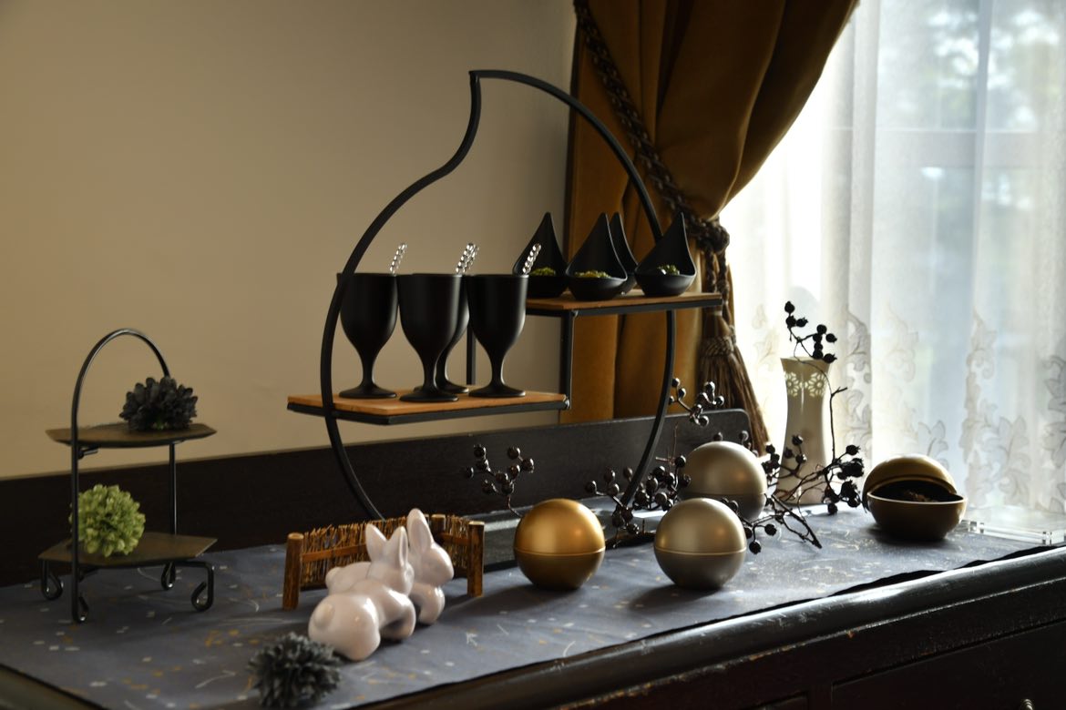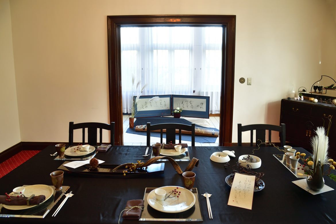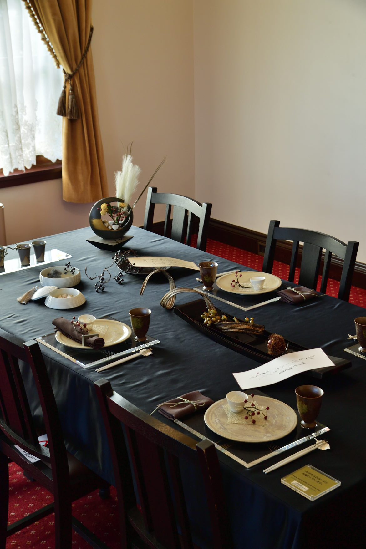 歴史的建造物の西洋館のもつ和洋折衷の世界観を大切に、日本の伝統的行事であるお月見を書道とテーブルコーディネートを掛け合わせ、高貴な和のイメージだけでなく、和洋問わず日常にお月見の行事を楽しめる空間を表現しています。