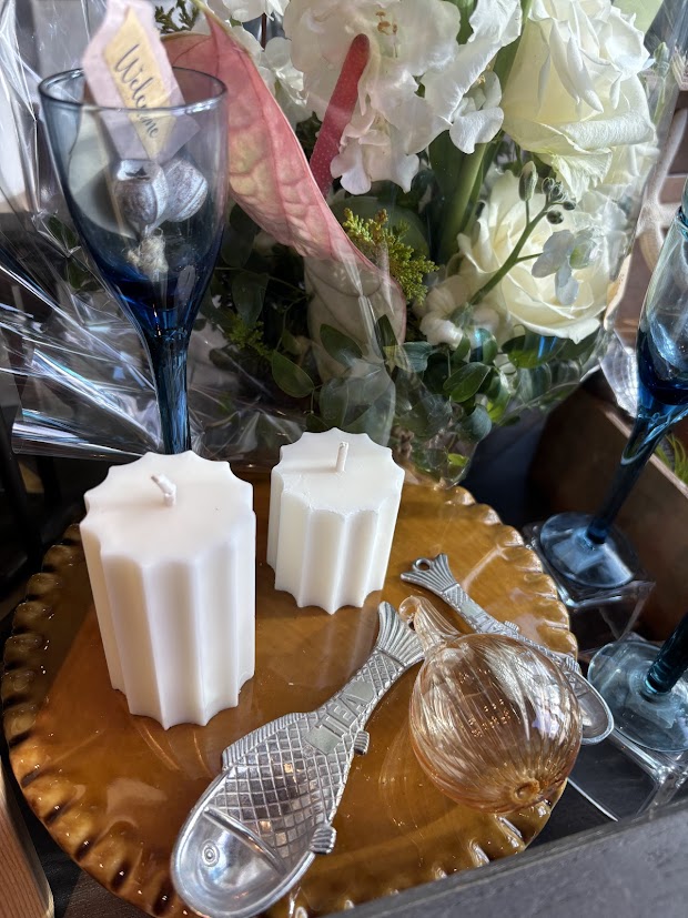 今回のウェルカムディスプレイは、今野さんの還暦祝いパーティーということで、山手西洋館の展示でご一緒してくださったA l’aise Candle(アレーズキャンドル)様からも還暦祝いということでキャンドルをプレゼントしていただきました。